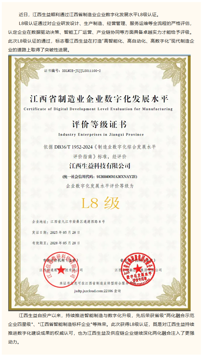 江西B体育·BSPORTS顺利通过江西省制造业企业数字化发展水平L8级认证