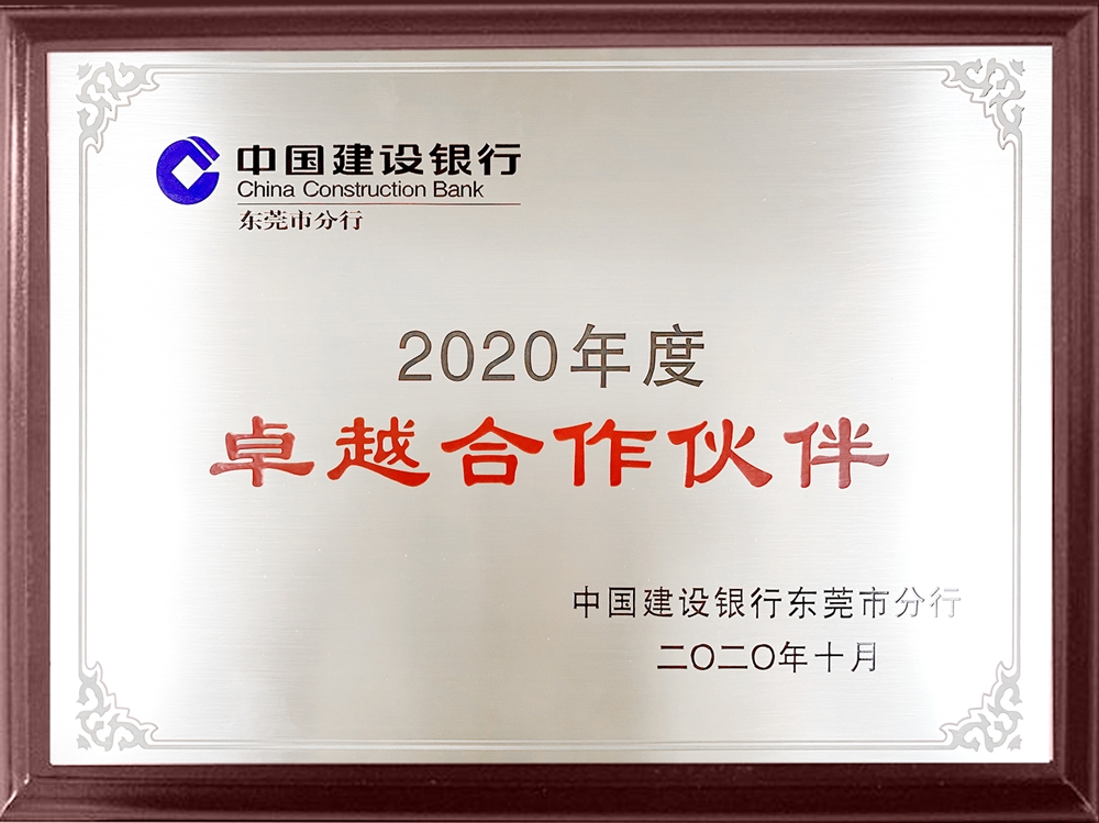 2020年11月6日,中国建设银行东莞市分行万江支行行长何勤方亲临广东B体育·BSPORTS,为我司颁发了中国建设银行东莞市分行“2020年度卓越合作伙伴”荣誉称号,广东B体育·BSPORTS总会计师何自强代表公司受奖。