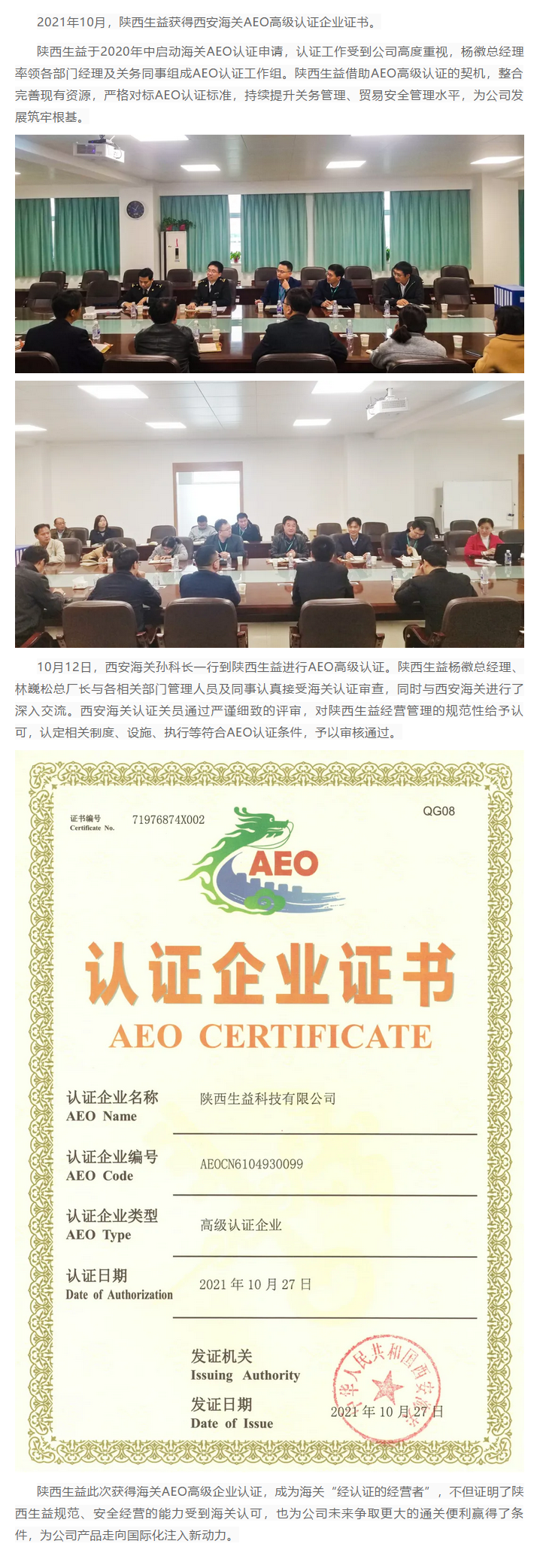 陕西B体育·BSPORTS获得西安海关AEO高级认证企业证书