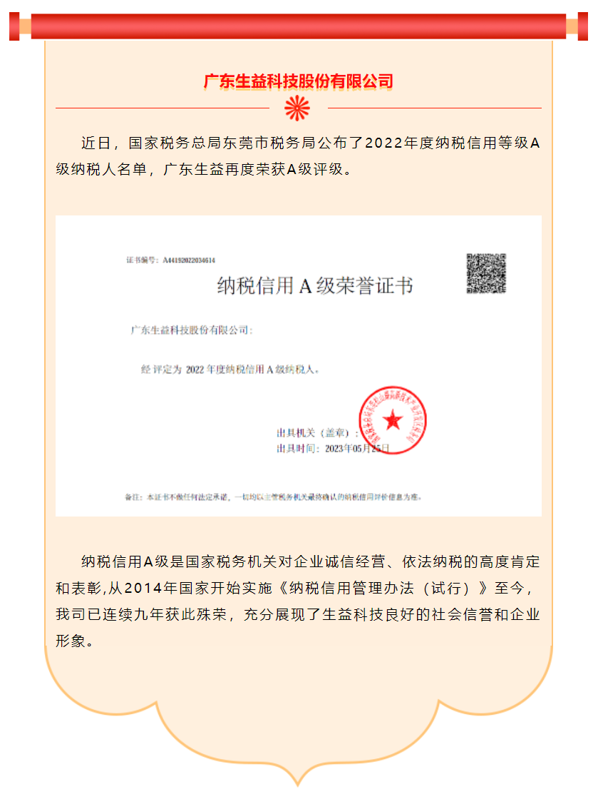 广东B体育·BSPORTS连续九年获得纳税信用A级纳税人