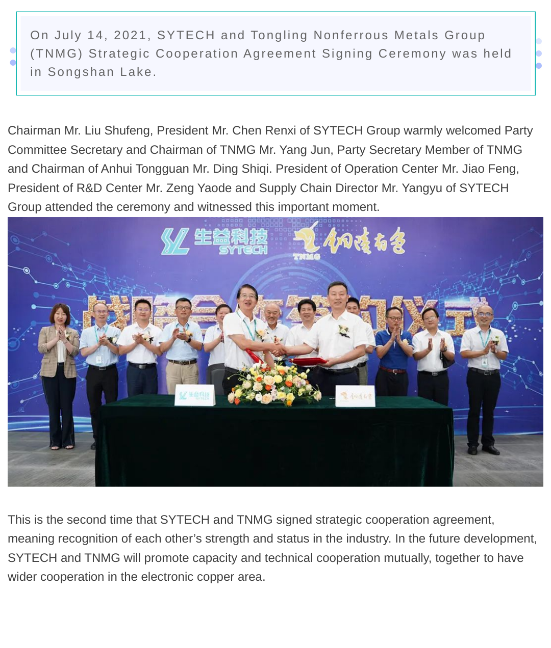 SYTECH and Tongling Nonferrous Metals Group Signed Strategic Cooperation Agreement