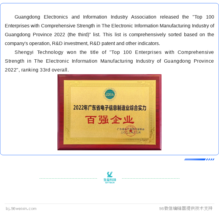 SHENGYI TECHNOLOGY WON THE TITLE OF "TOP 100 ENTERPRISES WITH COMPREHENSIVE STRENGTH IN THE ELECTRONIC INFORMATION MANUFACTURING INDUSTRY OF GUANGDONG PROVINCE 2022"