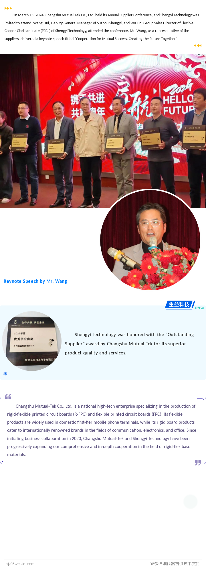 Shengyi Technology Awarded "Outstanding Supplier" by Changshu Mutual-Tek