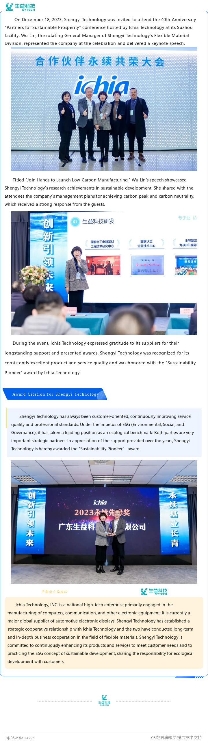 Shengyi Technology Honored with "Sustainability Pioneer" Award by Ichia Technology